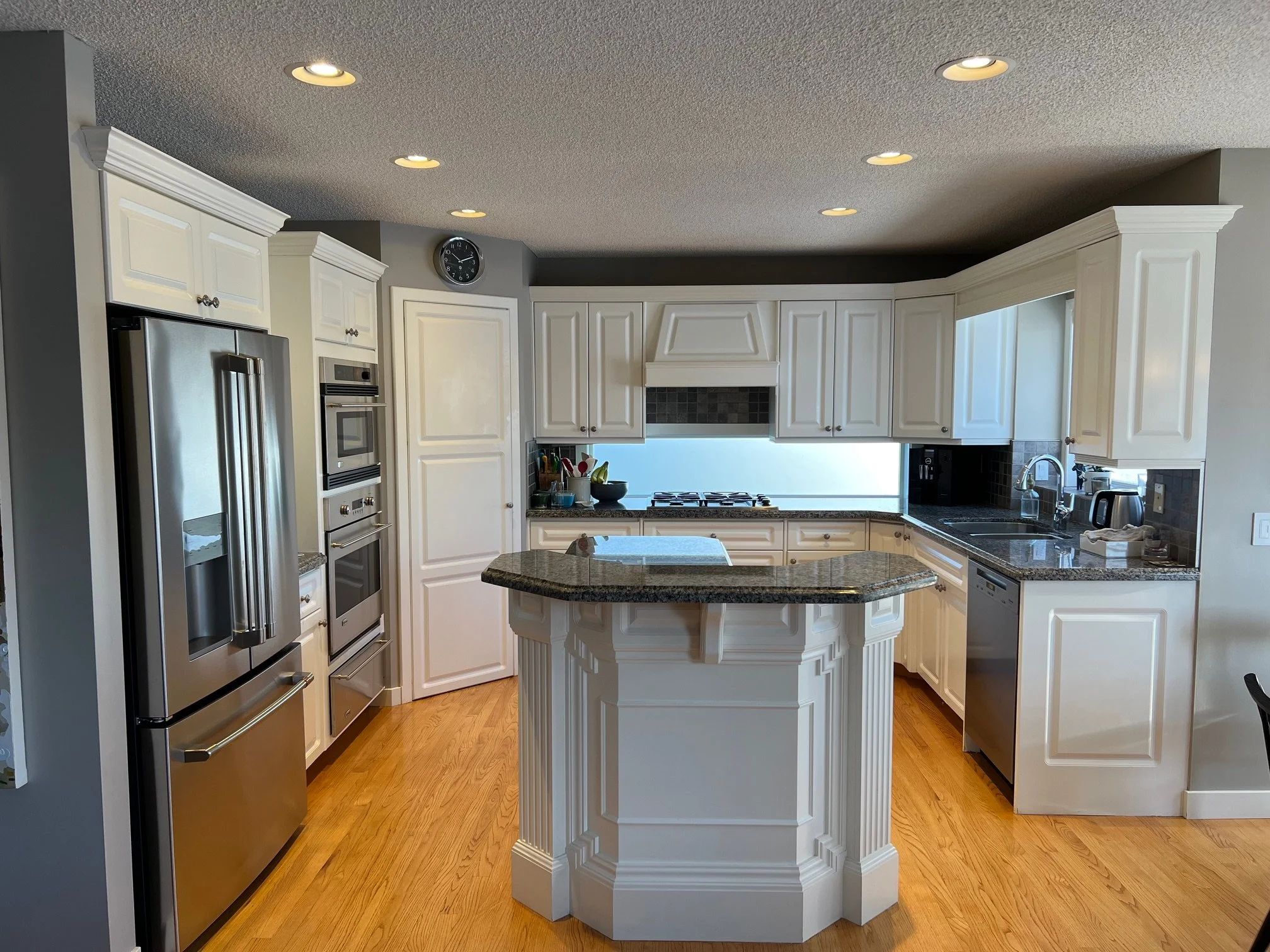 The existing kitchen was distinctly rooted in the 90s : the classic corner pantry, a double-tiered island, an awkwardly-placed backsplash window, and heavily profiled white cabinetry.