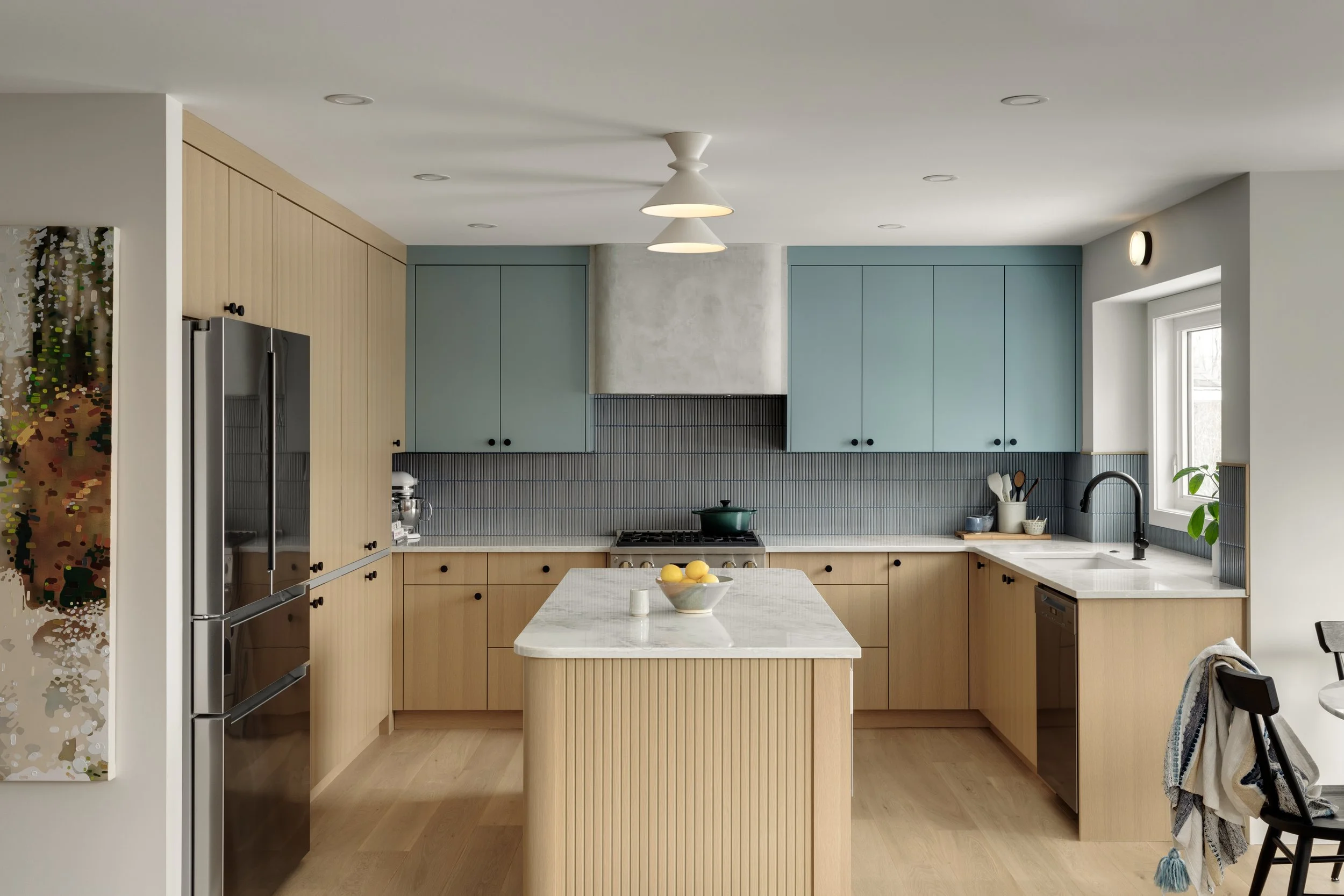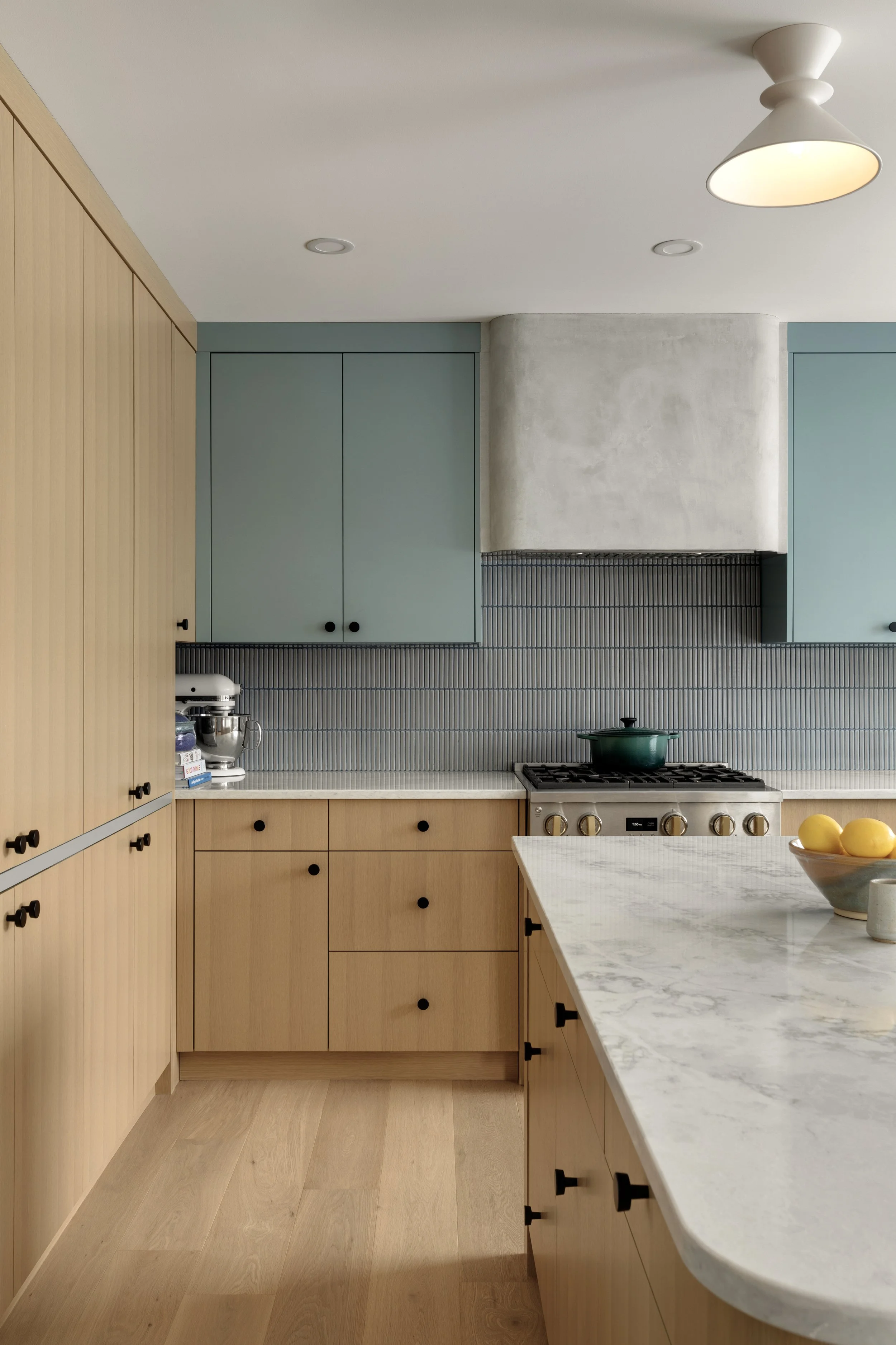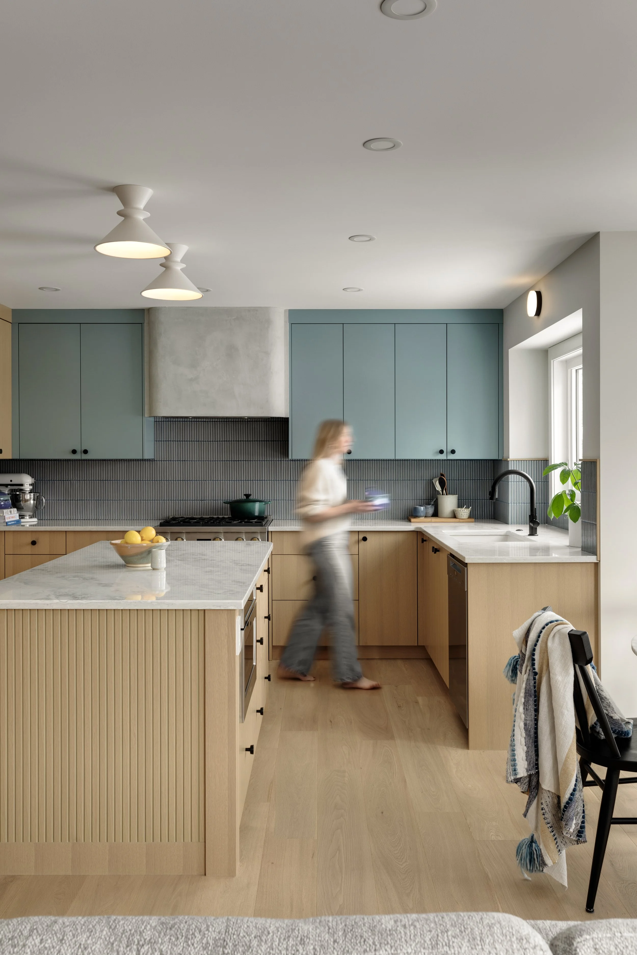 White oak cabinetry became the foundation of the design, bringing warmth and a timeless sensibility to the space. To complement the warmth of the wood, we introduced a palette of subdued, textural blues in the kitchen accents.