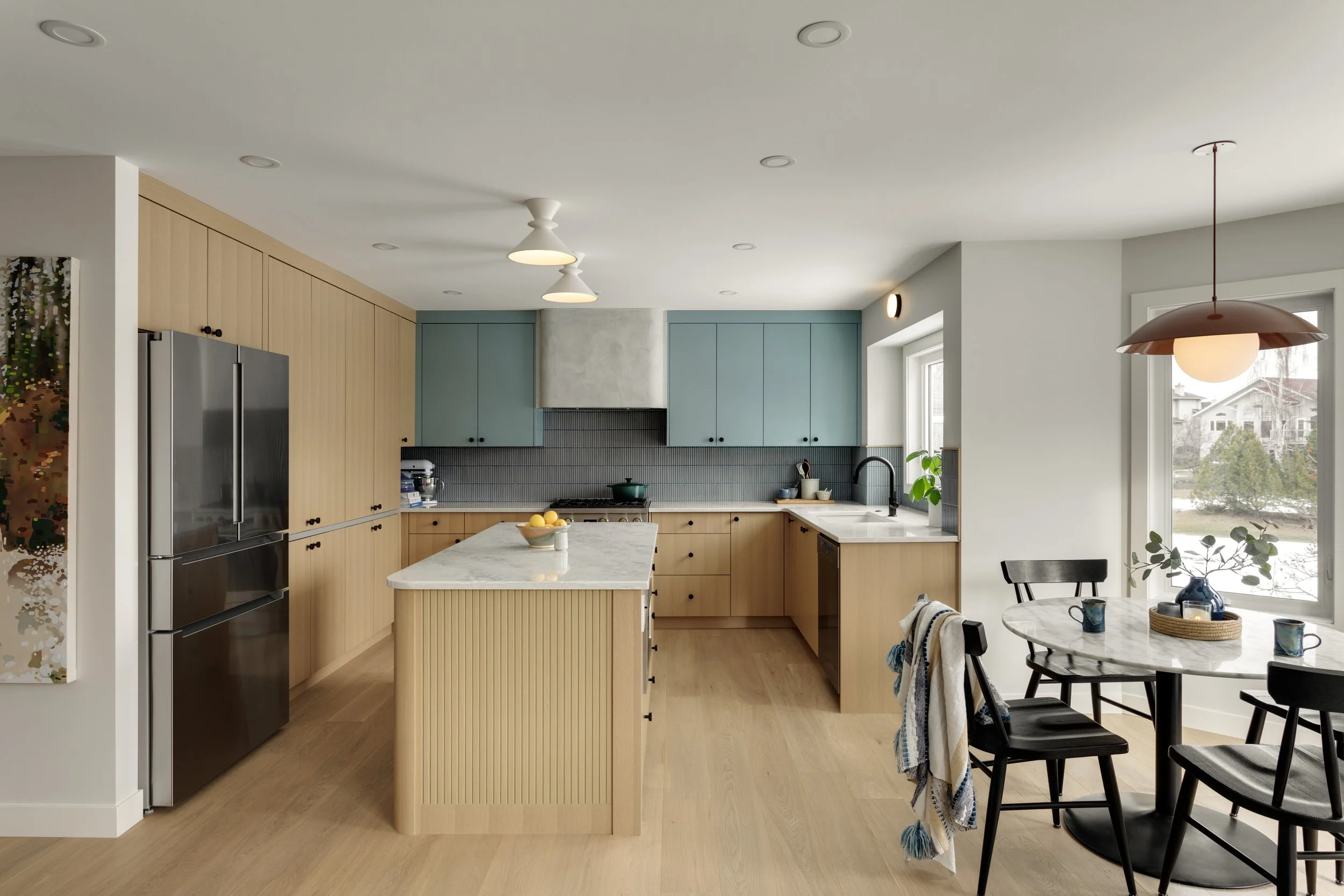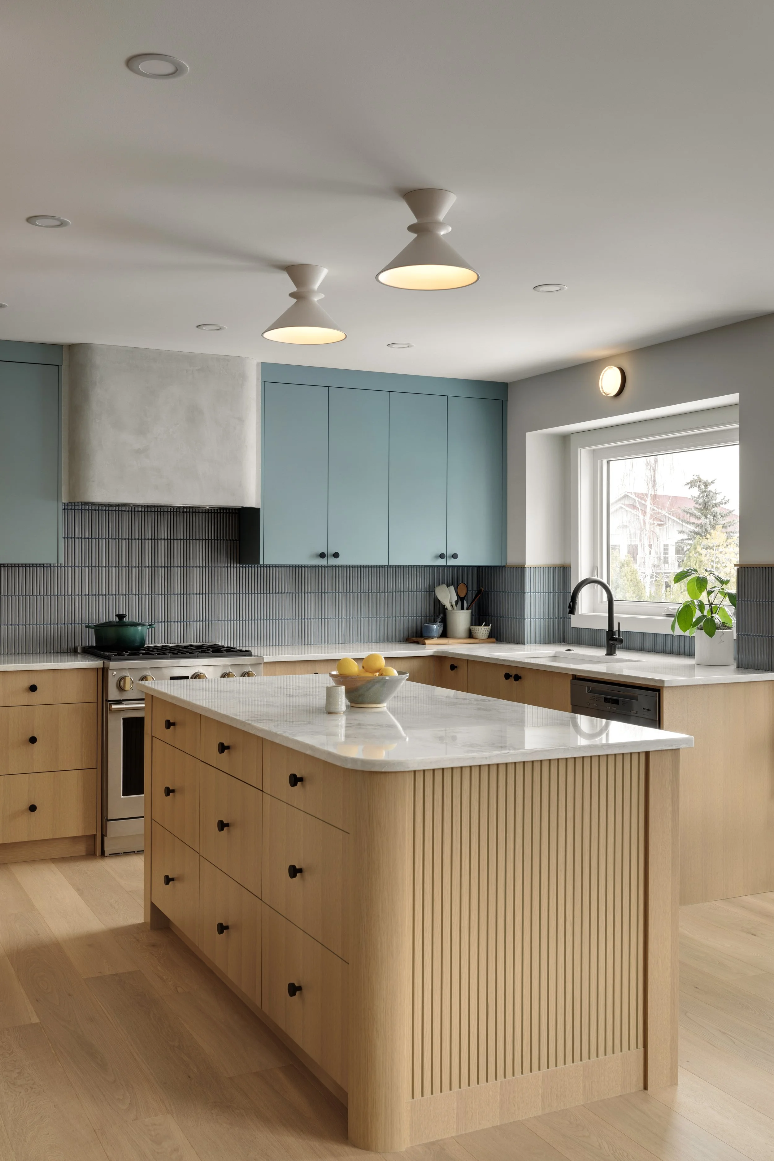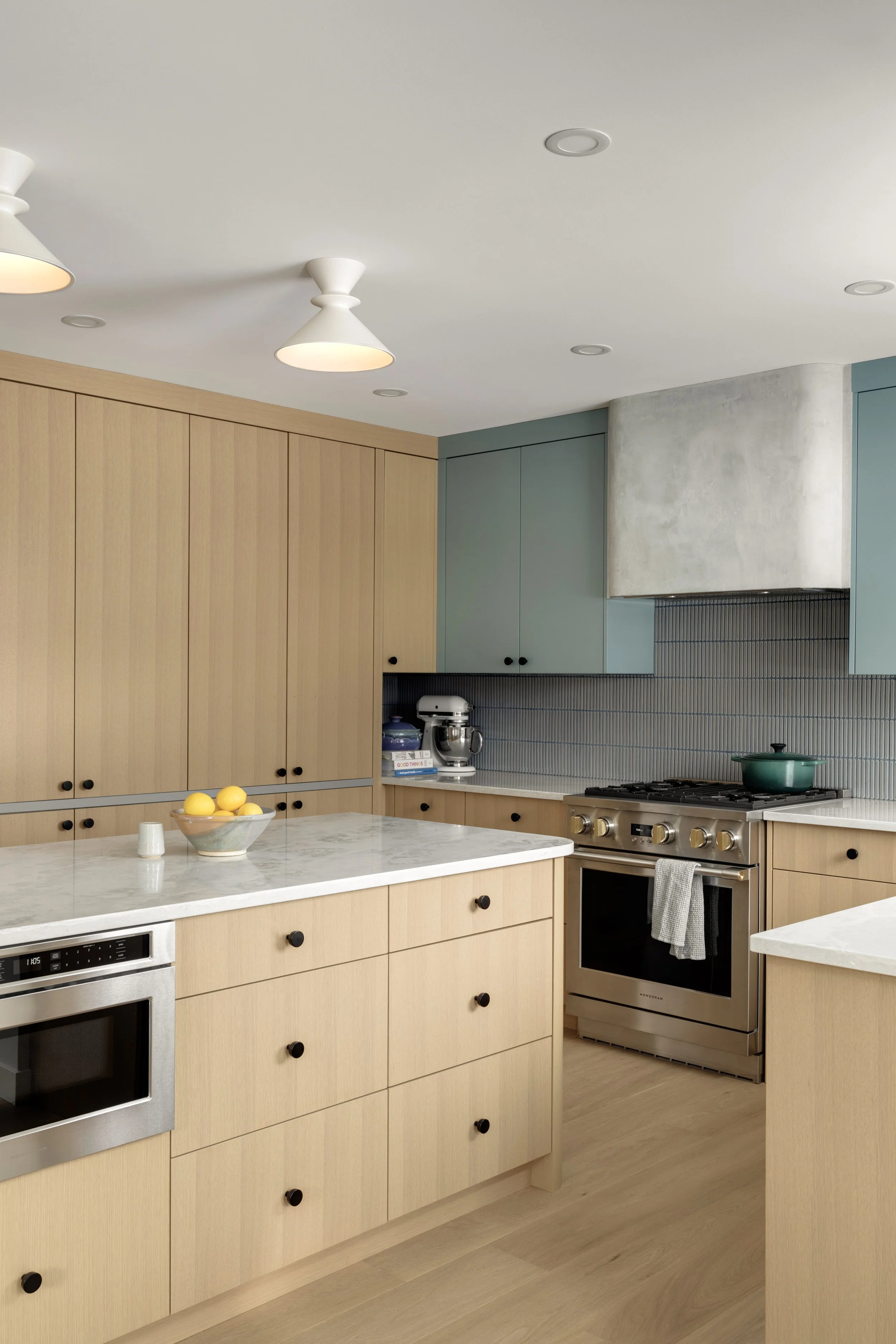 White oak cabinetry became the foundation of the design, bringing warmth and a timeless sensibility to the space. To complement the warmth of the wood, we introduced a palette of subdued, textural blues in the kitchen accents.
