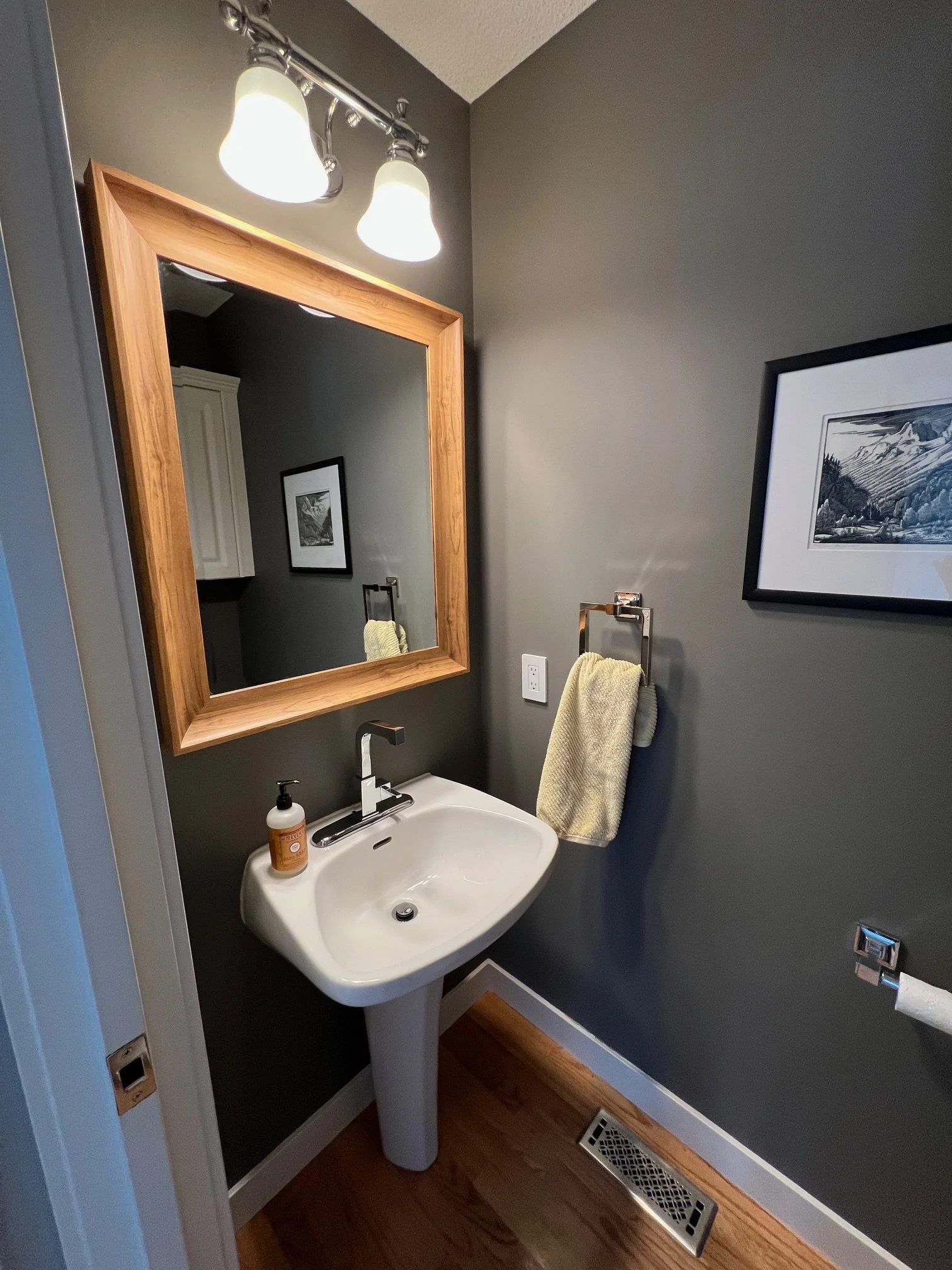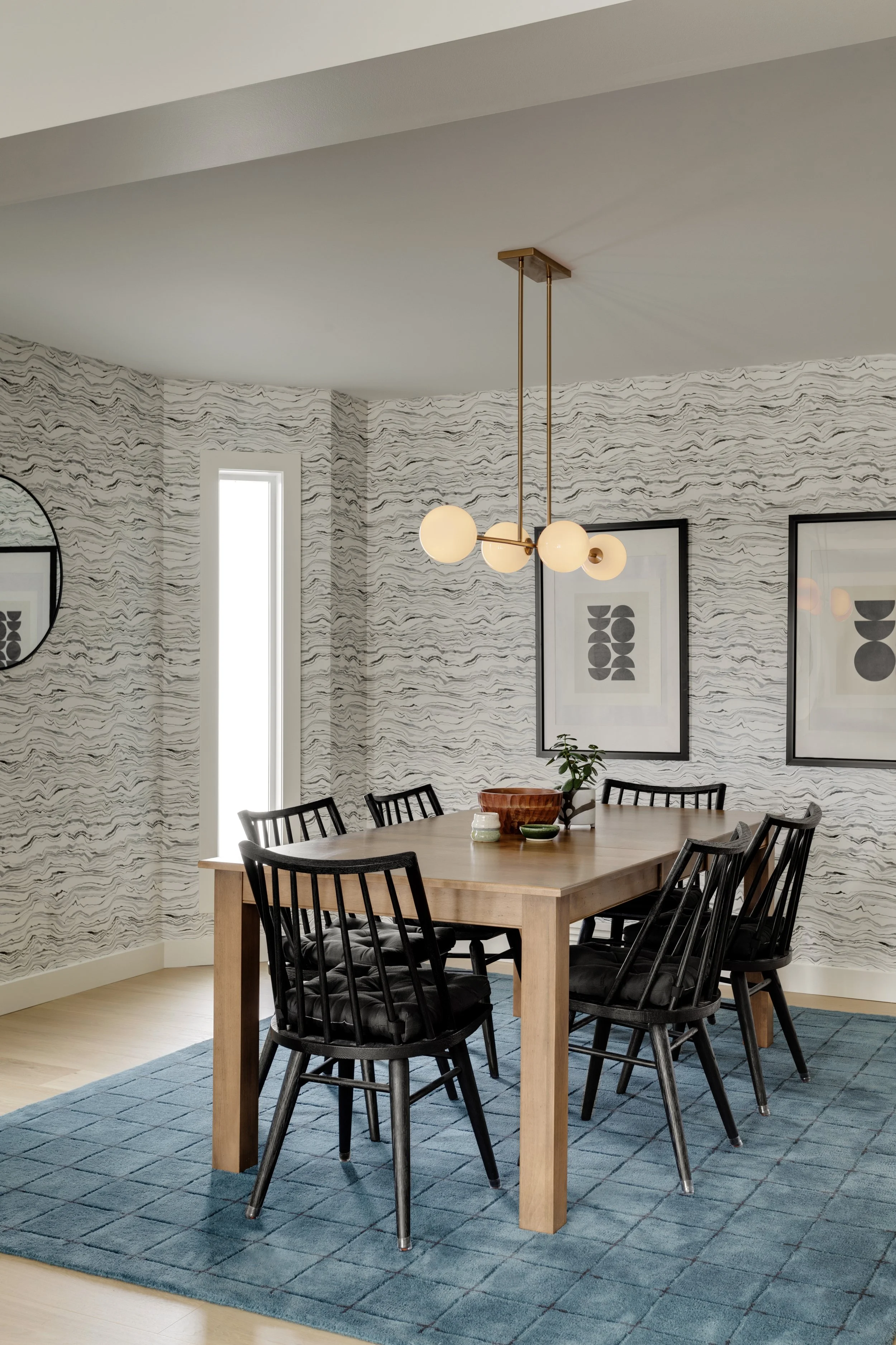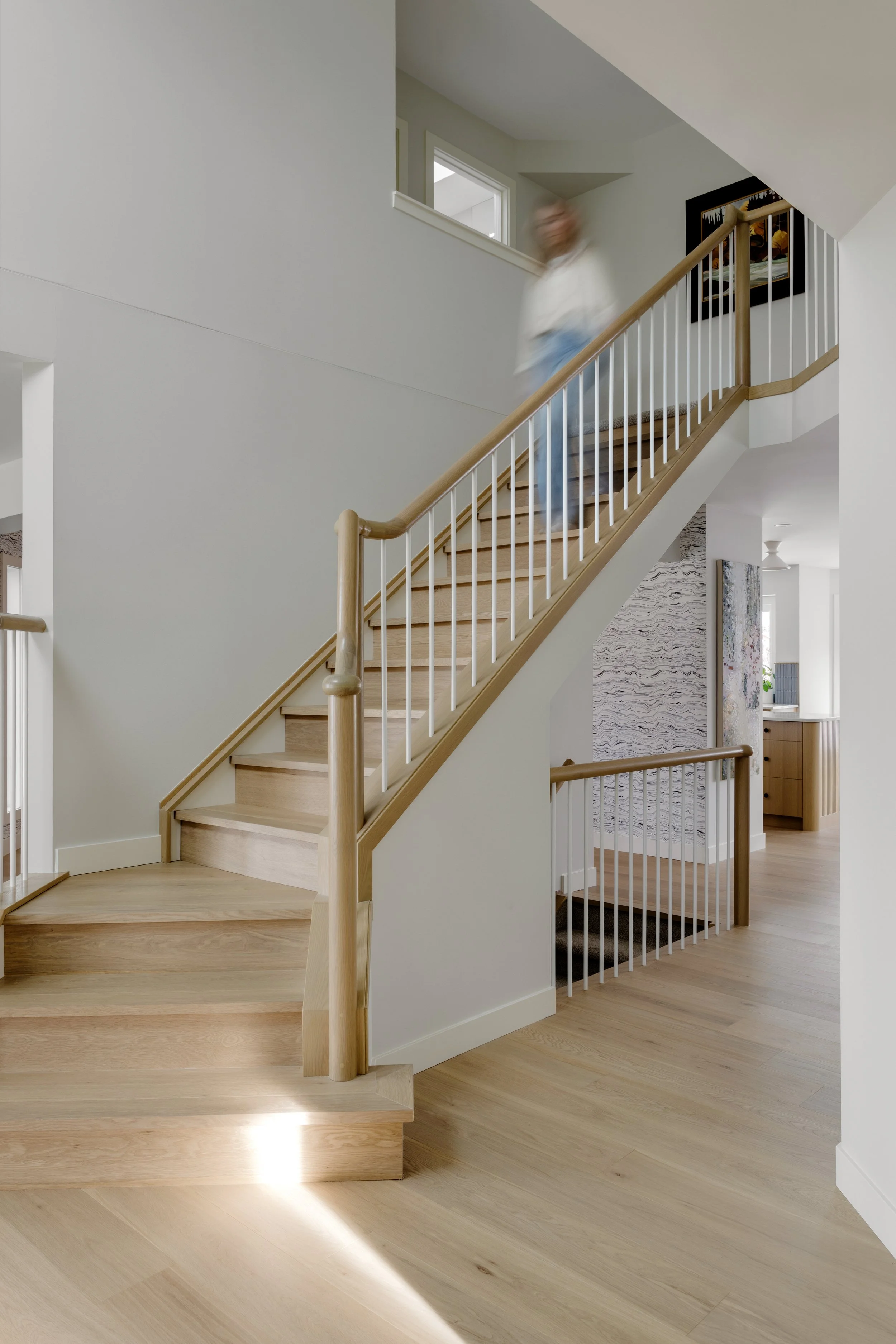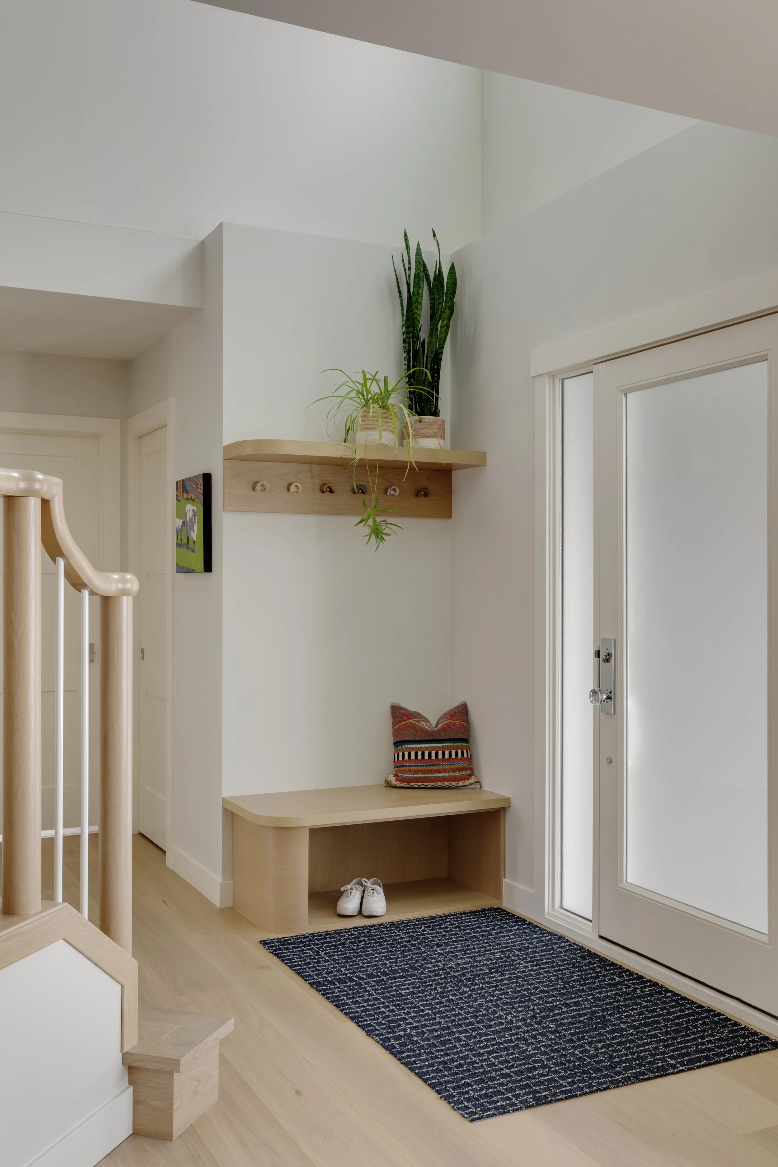 Beyond the kitchen, we turned our attention to some other areas as well. The foyer staircase — the first feature visible upon entering the home — was fully updated to create a more modern first impression. A built-in entry bench adds style and function, and the powder room received a playful refresh with a funky wallpaper and concrete sink.